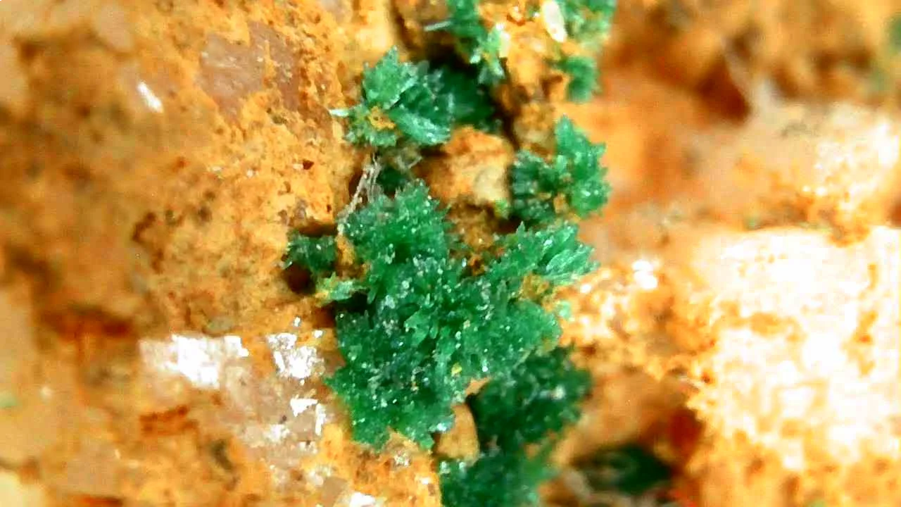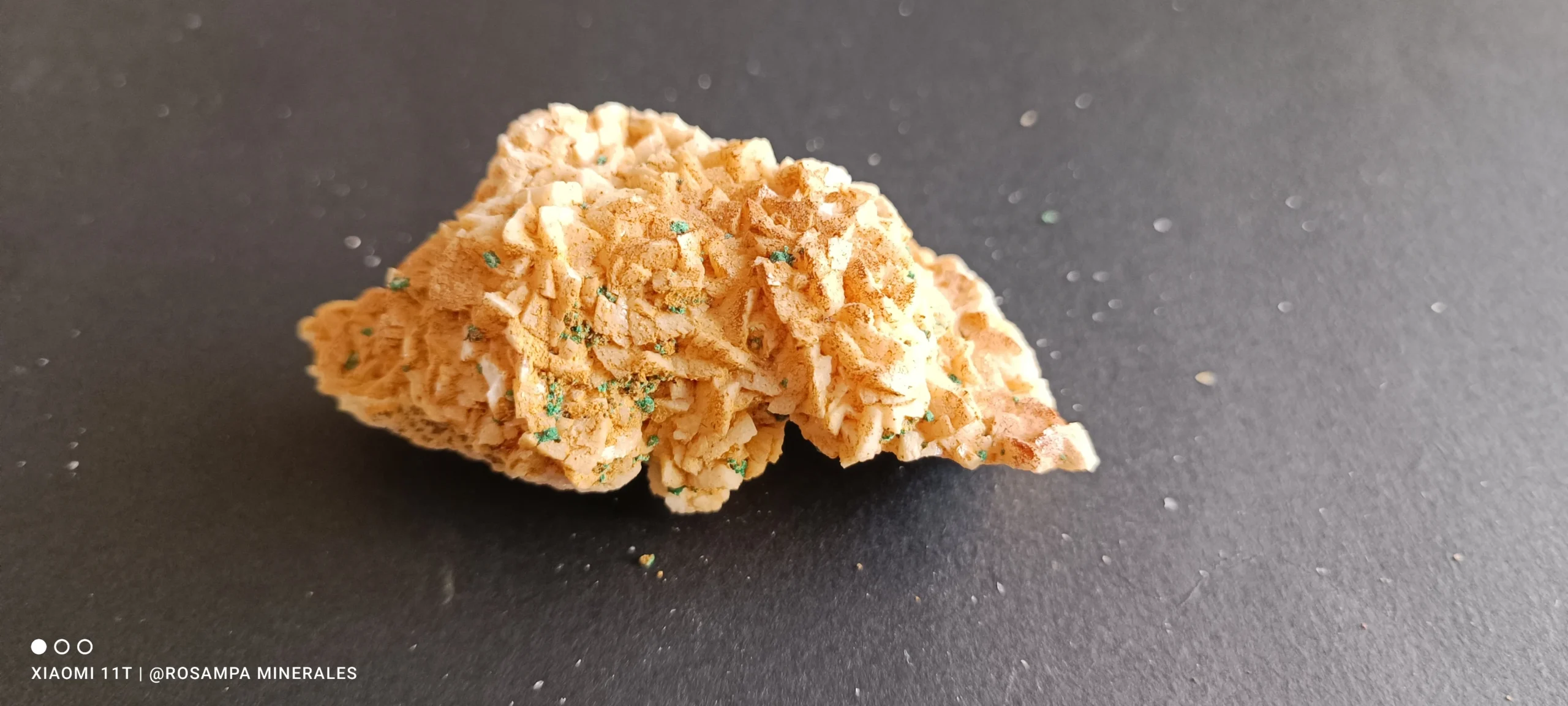 Drusa de dolomitas de color anaranjado con algunos puntos de malaquita. Una pieza con un bonito contraste y con zonas para disfrutar con el binocular.