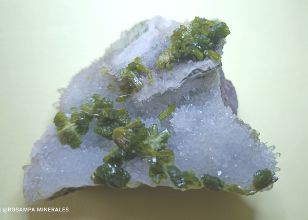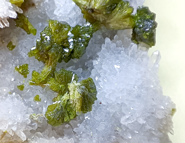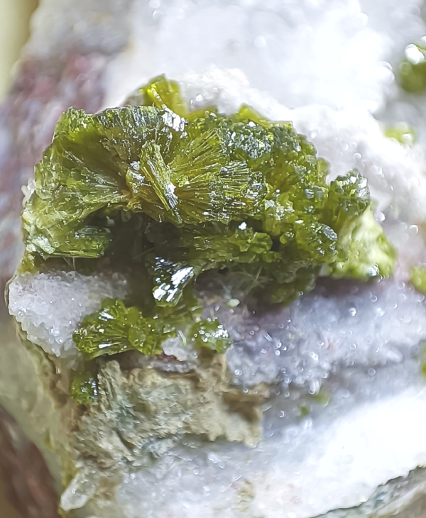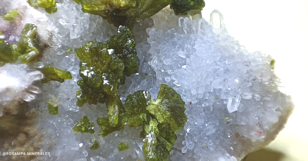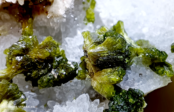 Grupos de cristales en agregados radiales de color verde sobre una matriz con cristales de cuarzo transparente que hacen un contraste espectacular.