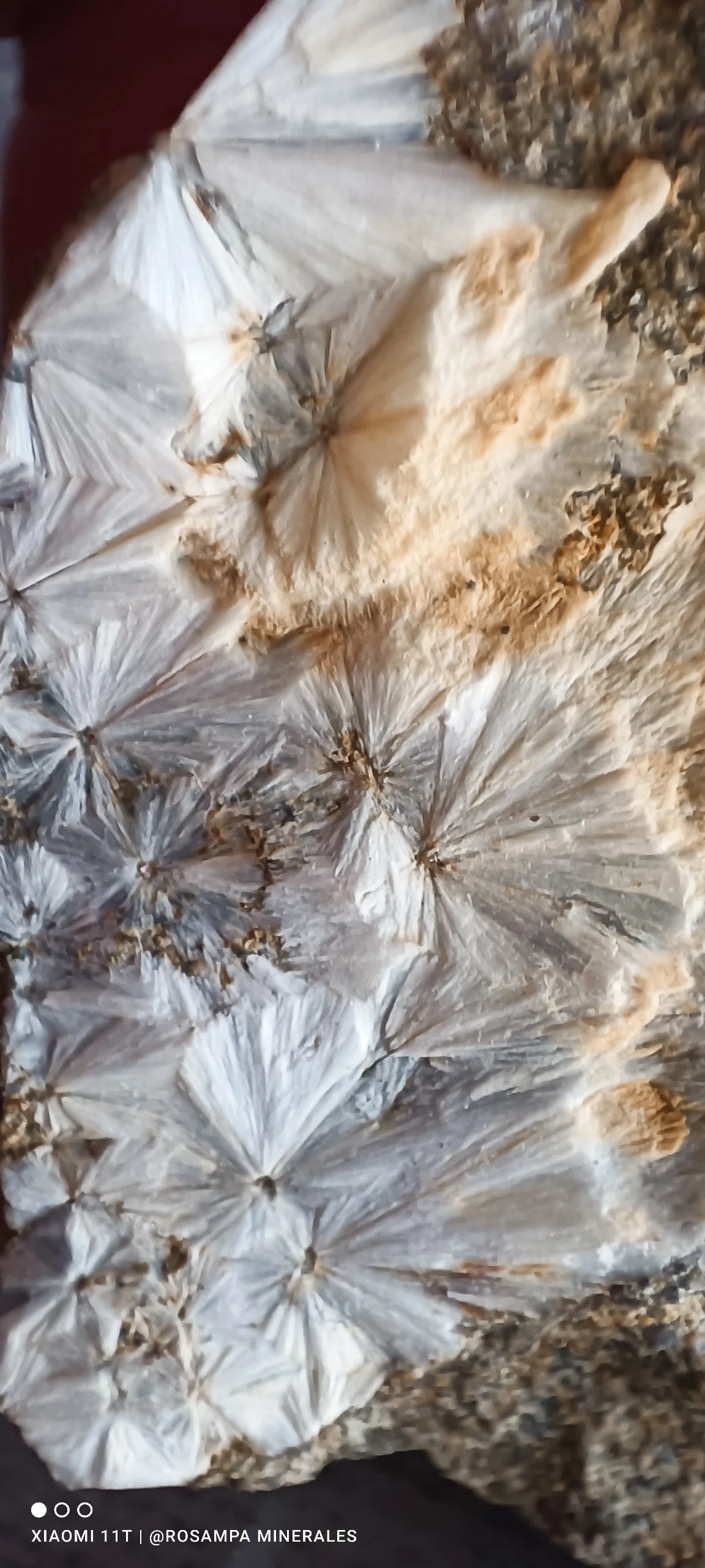 La escolecita es un mineral perteneciente al grupo de los zeolitas, compuesto principalmente por silicato hidratado de calcio, con fórmula CaAl₂Si₃O₁₀·3H₂O. Su color varía desde incoloro a blanco, pudiendo presentar tonalidades crema o rosadas suaves, y muestra un brillo vítreo a sedoso, especialmente en agregados fibrosos. Posee una dureza de 5–5,5 en la escala de Mohs y presenta fractura irregular, con exfoliación perfecta según el plano prismático. Suele aparecer formando cristales aciculares o prismáticos delgados, a menudo dispuestos en agregados radiales, plumosos o fasciculares. Cristaliza en el sistema monoclínico. Su nombre proviene del griego skolex (“gusano”), en alusión a la tendencia del mineral a “retorcerse” o romperse en finas láminas curvas al calentarse. Se forma como mineral secundario en cavidades volcánicas (geodas) y basaltos, siendo típico de ambientes hidrotermales de baja temperatura, y aparece asociado a otras zeolitas como la stilbita, heulandita o natrolita. En España se ha citado en diversas localidades volcánicas de las Islas Canarias y en zonas basaltíticas de Cataluña. Entre los yacimientos más destacados del mundo figuran Pune y Nasik (India), famosos por sus grandes cristales radiantes, además de Islas Feroe, Islandia y Oregón (EE. UU.). Es un mineral muy valorado por coleccionistas debido a la delicadeza y elegancia de sus cristales aciculares y sus espectaculares agregados radiados.