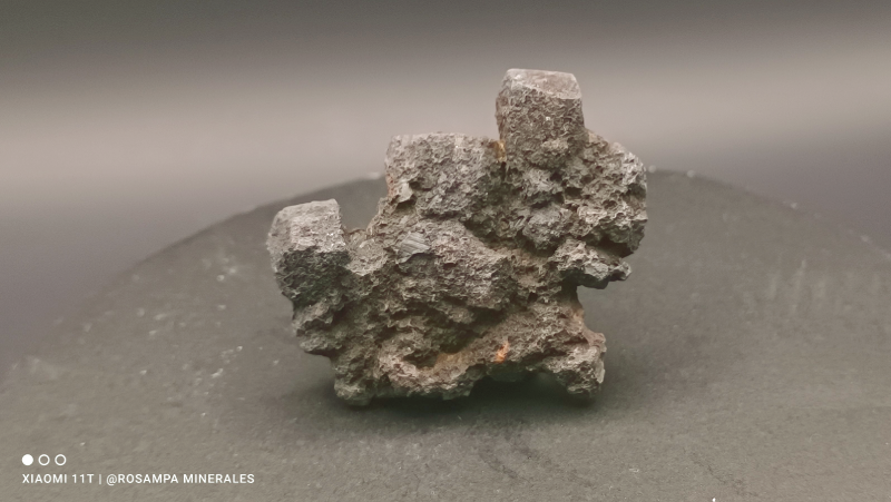 Curioso ejemplar donde la goethita ha sustituido a la pirita y se muestra como cubos de color negro.  Ejemplar antiguo.