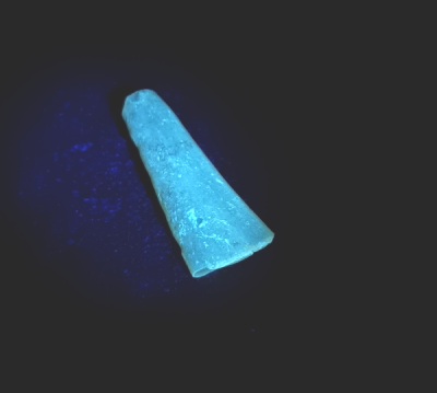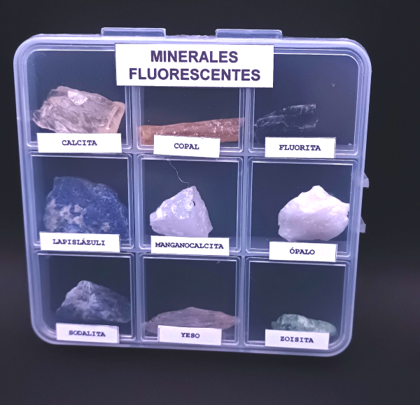 Cajita de plástico con 9 minerales naturales con fluorescencia en diferentes colores, para ver bien el fenómeno hace falta una luz UVA con longitud de onda 365nm. Cada cajita tiene los mismos minerales, puede variar el aspecto y el tamaño.  Incluye tarjeta test de UV. Estos son los minerales y colores: