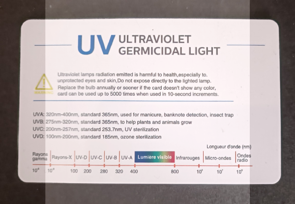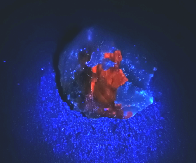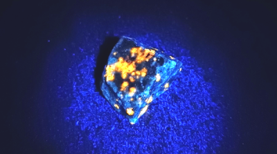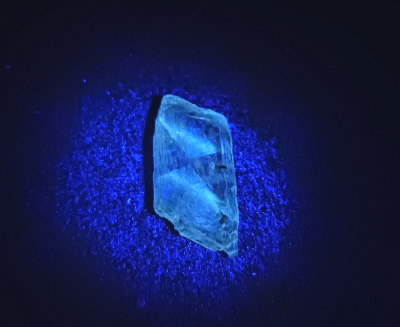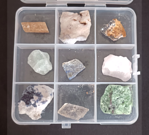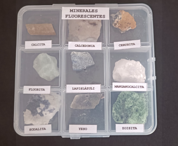 Cajita de plástico con 9 minerales naturales con fluorescencia en diferentes colores, para ver bien el fenómeno hace falta una luz UVA con longitud de onda 365nm. Cada cajita tiene los mismos minerales, puede variar el aspecto y el tamaño.  Incluye tarjeta test de UV. Estos son los minerales y colores: