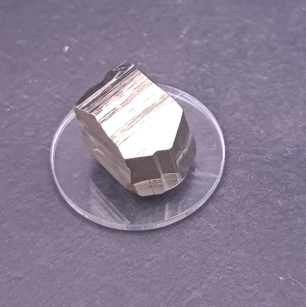 Cristal con esa forma intermedia entre el dodecaedro y el cubo, buena cristalización y brillo natural, una forma frecuente en esta conocida localidad riojana. Presentados sobre un soporte circular transparente de 25 mm.