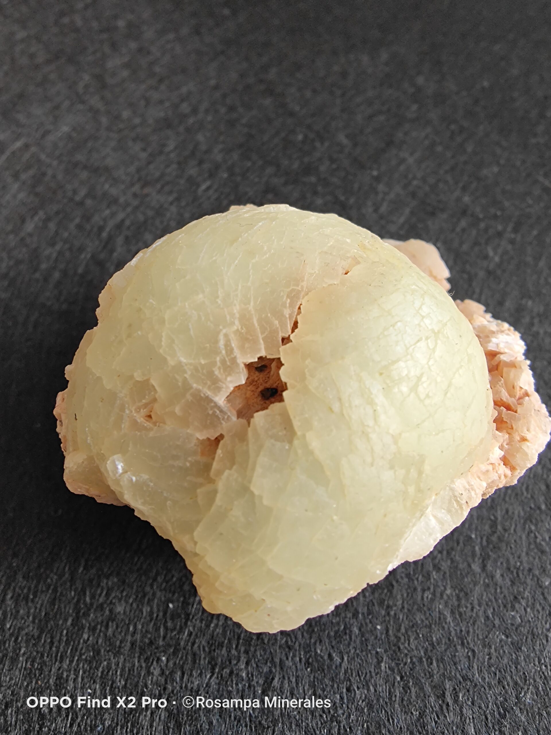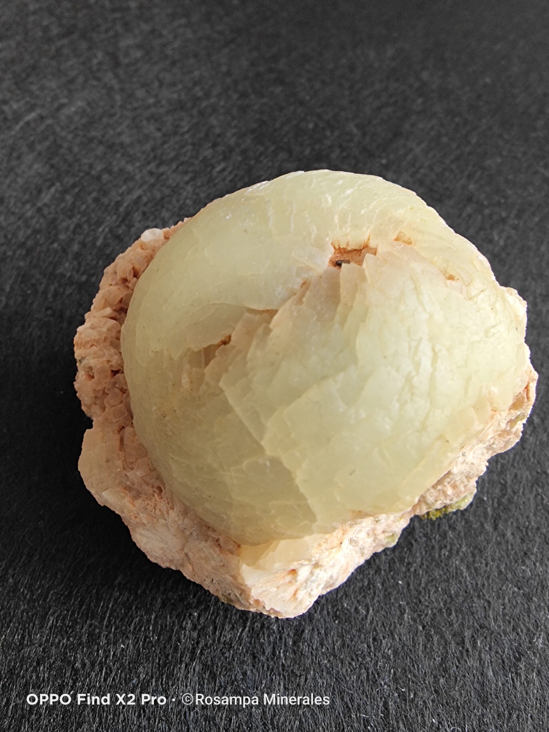 Agregado botroidal de Prenhitas de color verde pálido, subtranslucido , con brillo vitreo. En la parte posterior se pueden observar los cristales verdes de Epidotas.