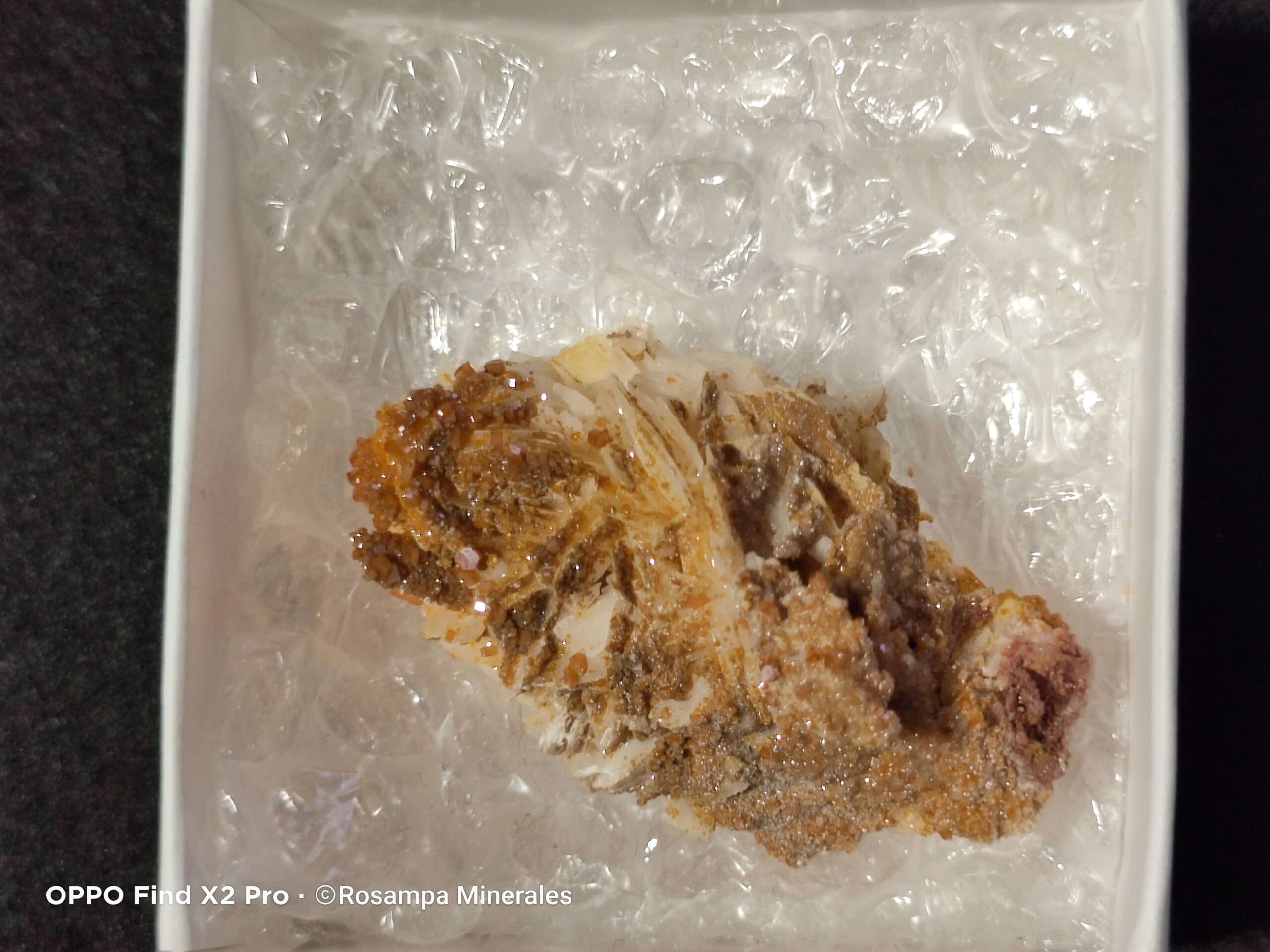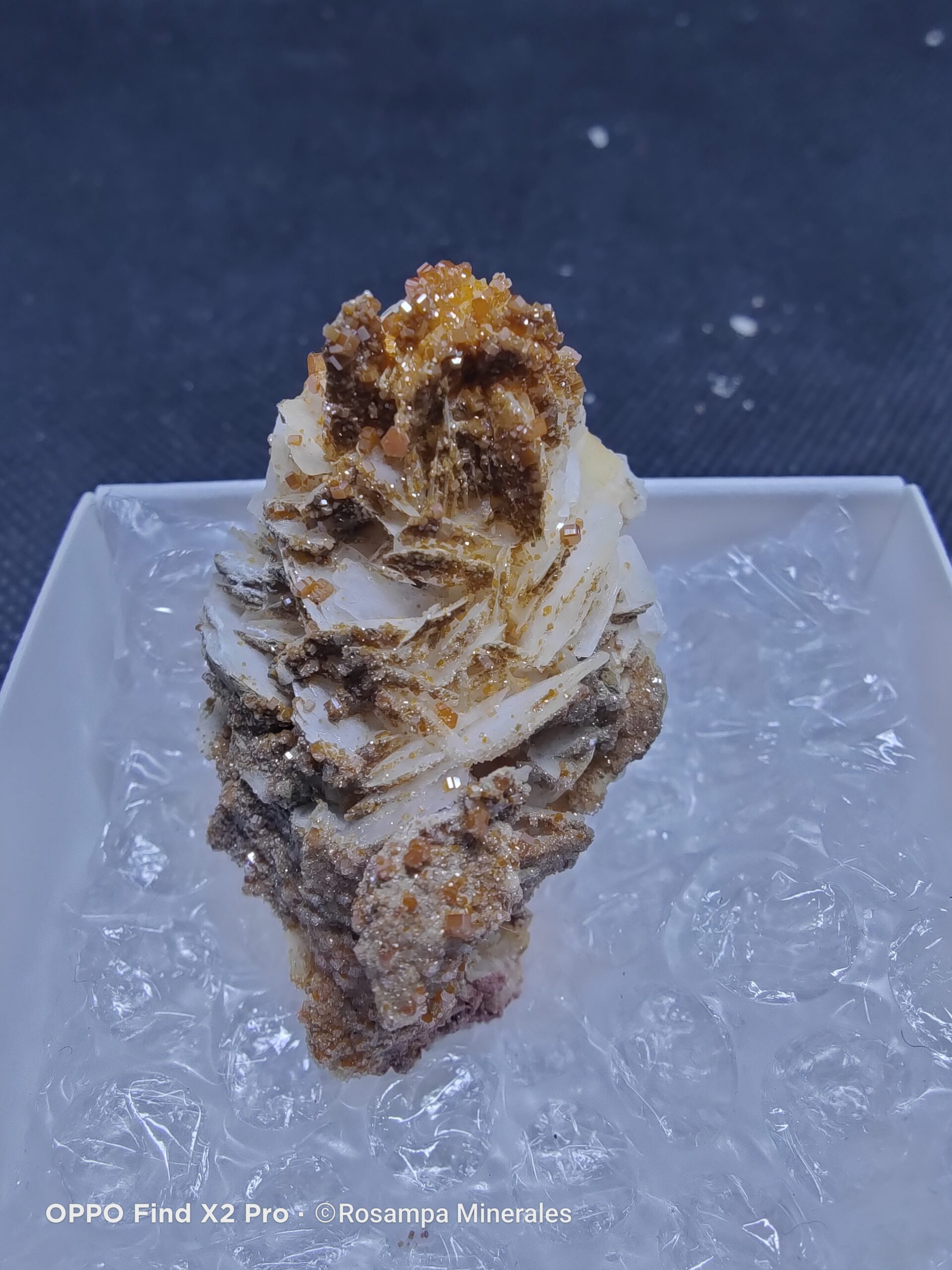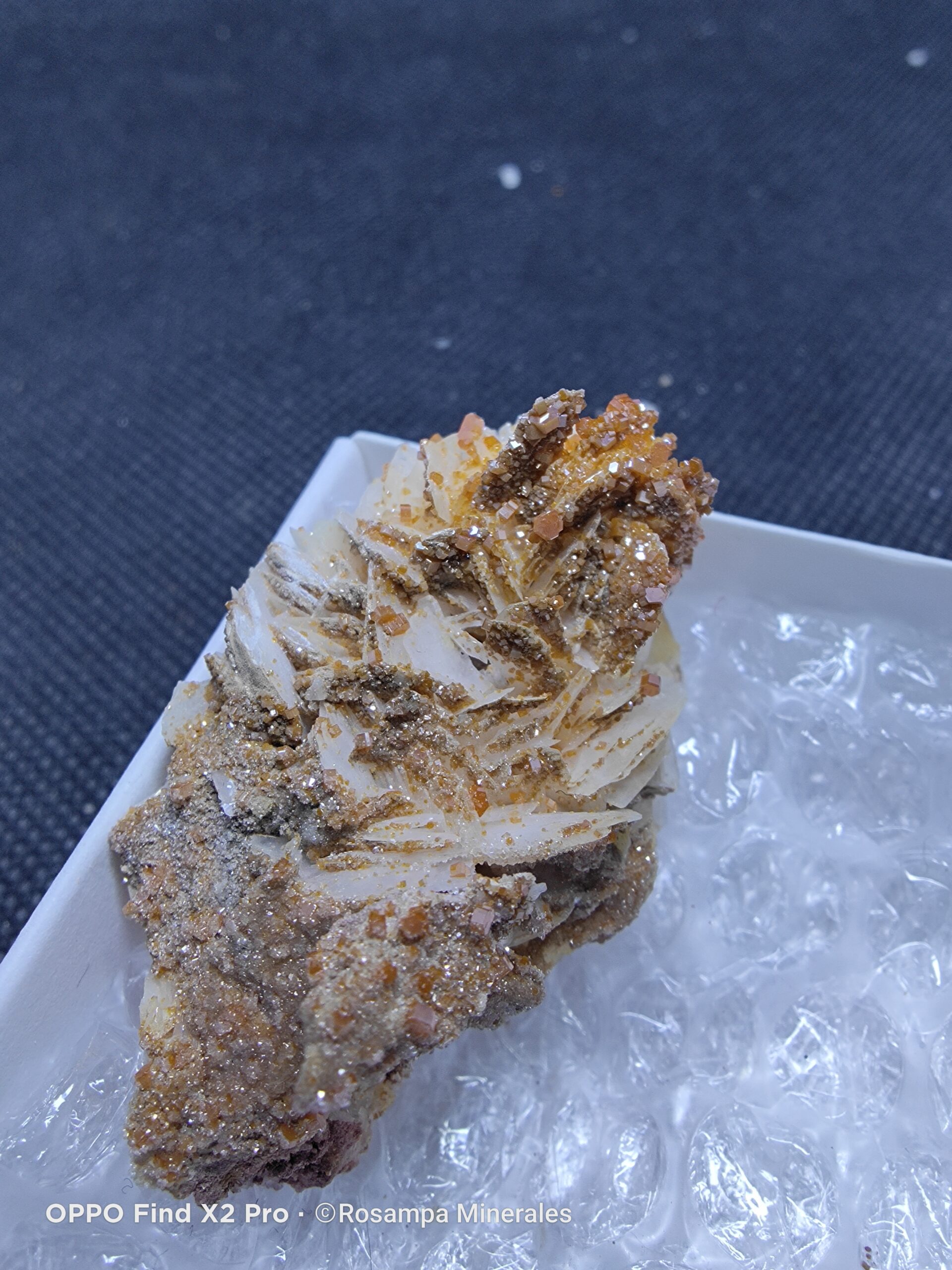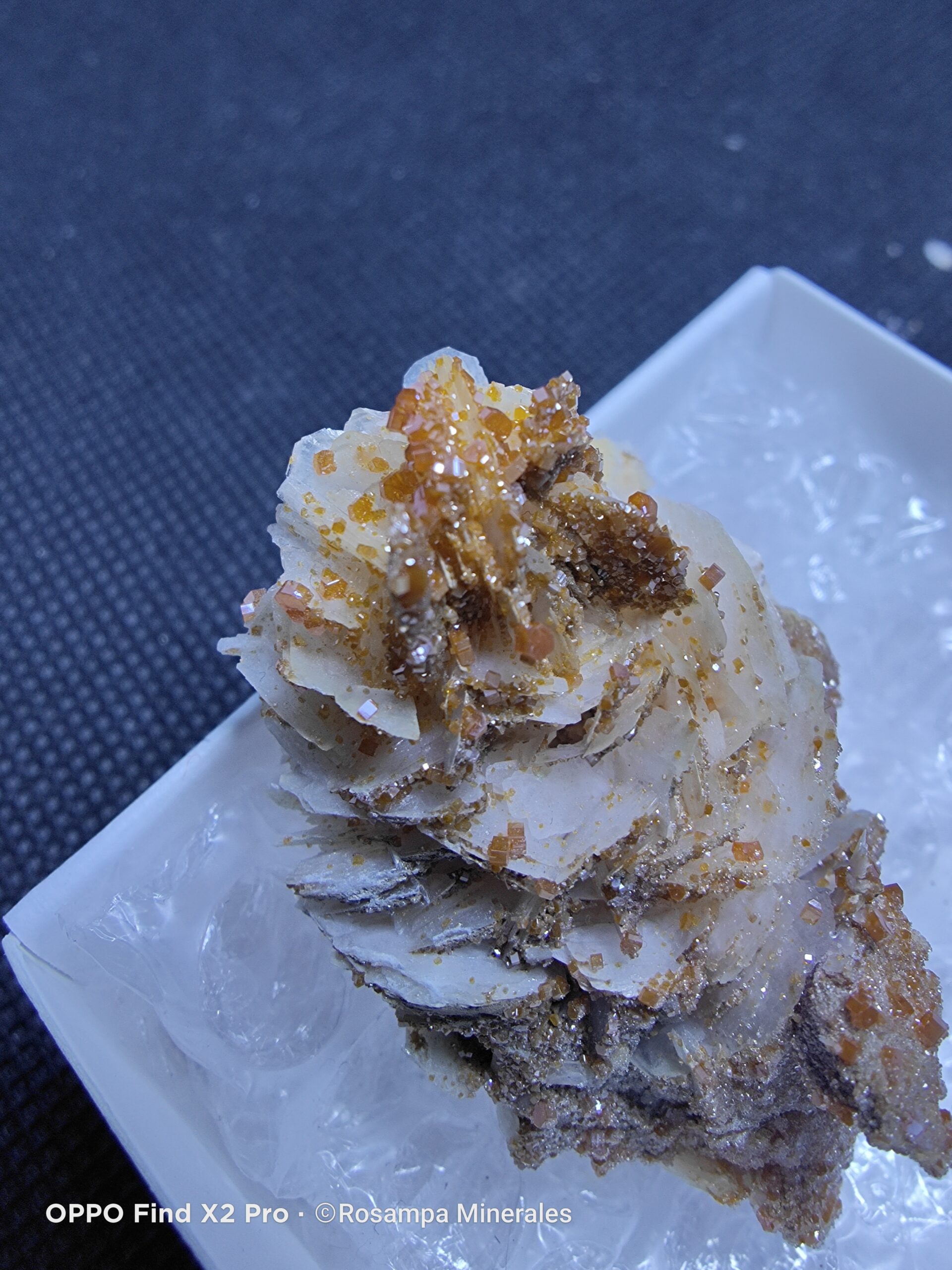 Grupo de brillantes vanadinitas naranjas sobre delicados cristales blancos. Una pieza mineral única, de intenso color y gran atractivo visual, ideal para coleccionistas y amantes de la mineralogía. Pieza muy estética y con mucho brillo.