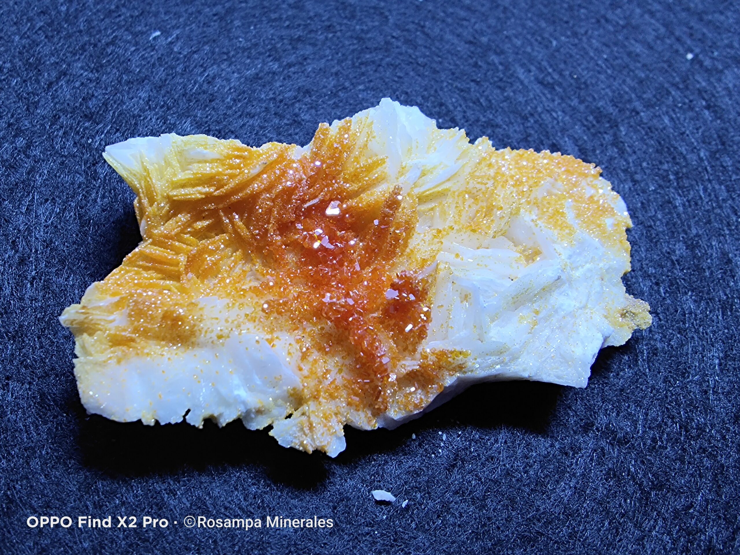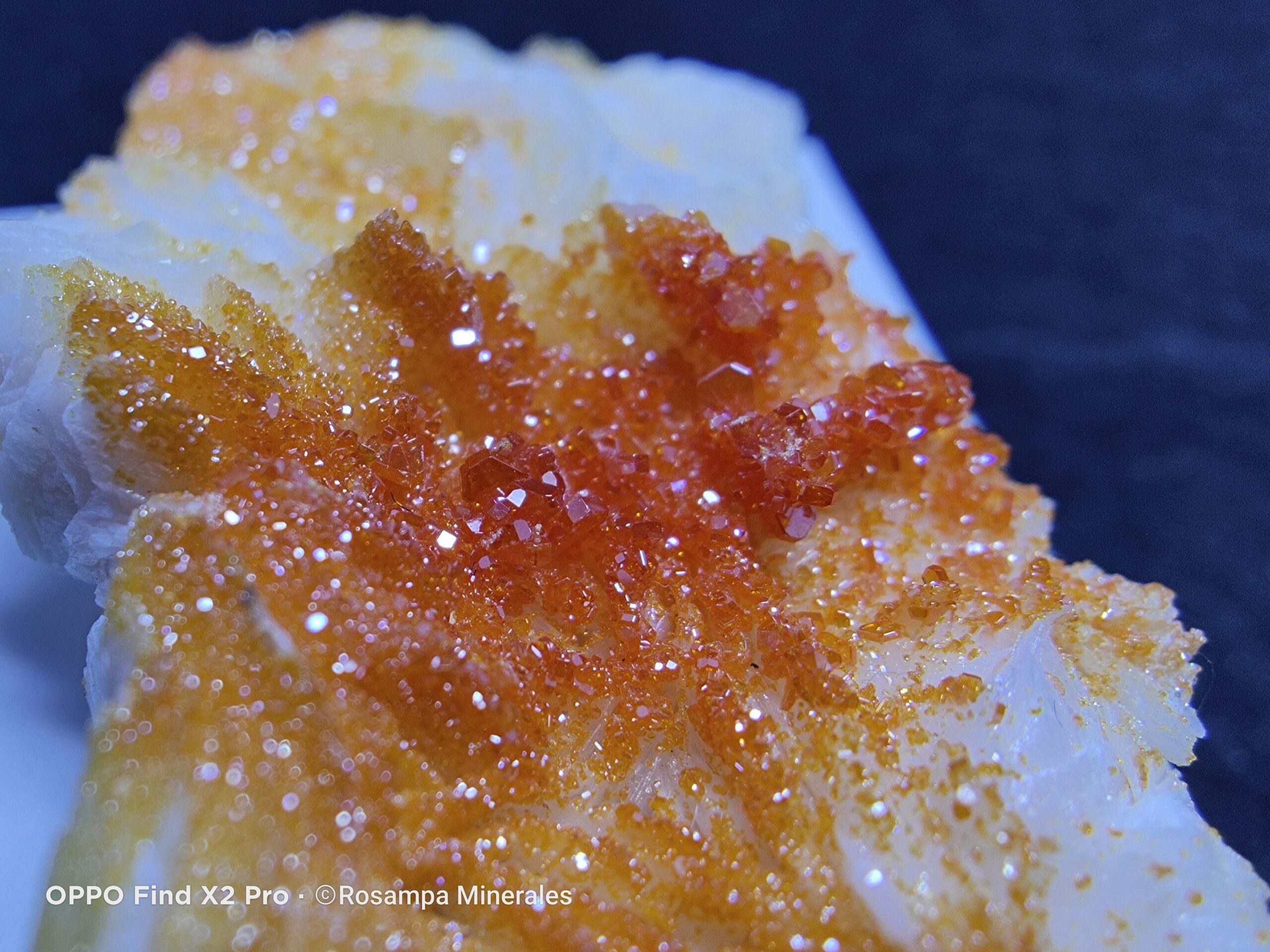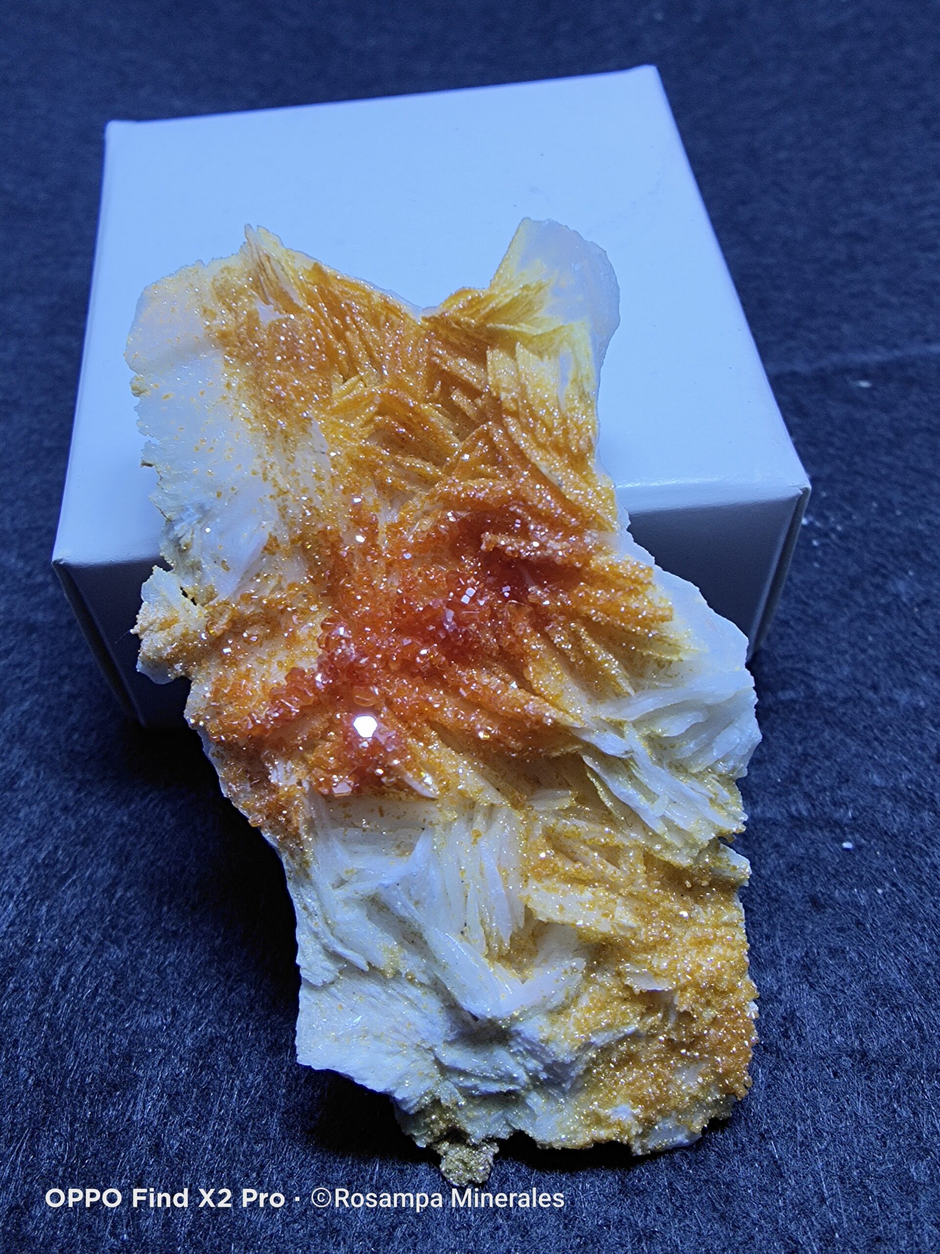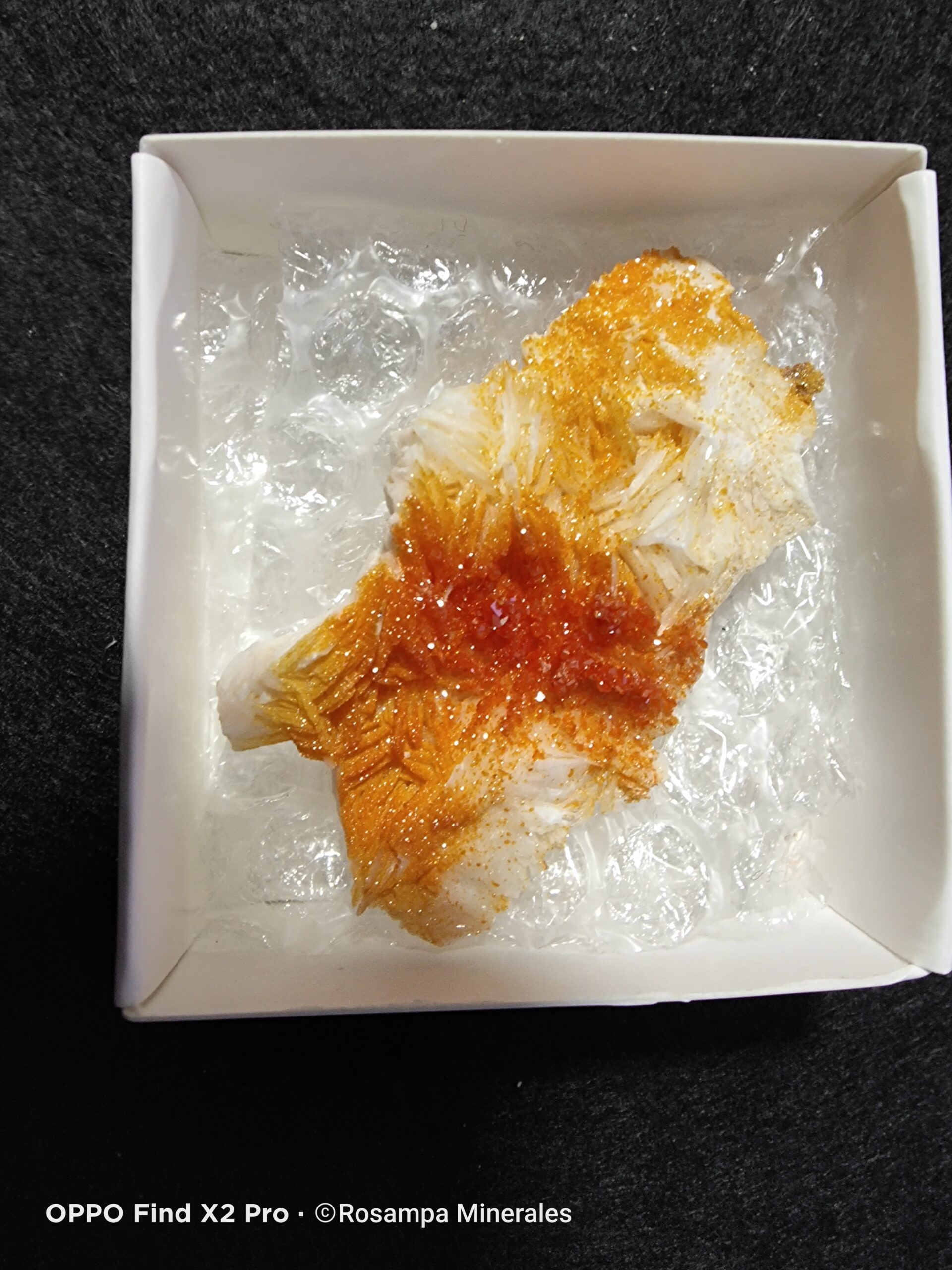 Grupo de vanadinitas rojas y naranjas sobre barita blanca de Mibladen. Un ejemplar mineral de gran brillo y contraste, perfecto para coleccionistas que buscan piezas estéticas y auténticas de esta famosa localidad.